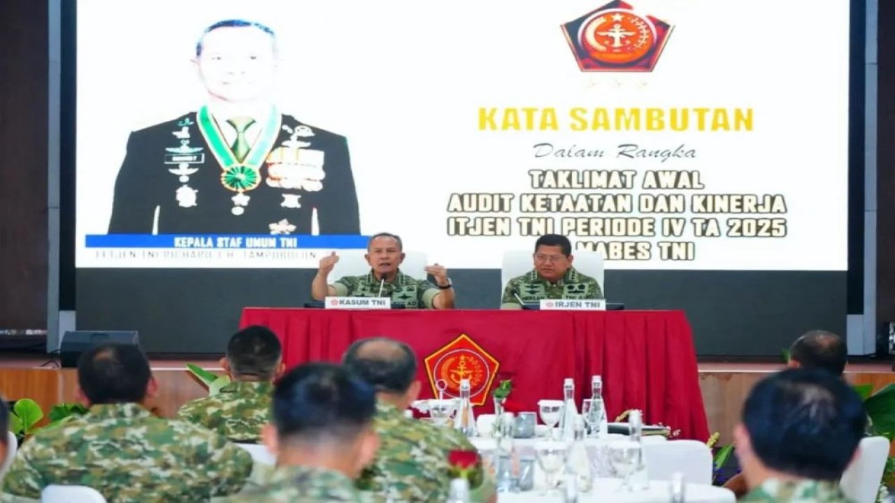 Kepala Staf Umum (Kasum) TNI Letjen TNI Richard Tampubolon didampingi Irjen TNI Laksdya TNI Hersan membuka Taklimat Awal Audit Ketaatan dan Kinerja Inspektorat Jenderal (Itjen) TNI Periode IV TA 2025 di Aula Bhineka Eka Bhakti Mako Akademi TNI, Cilangkap, Jakarta Timur/Foto: Istimewa