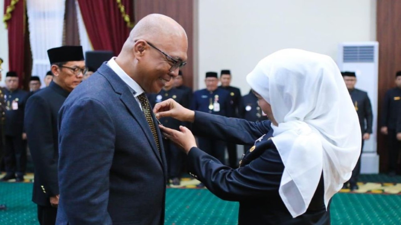 Nusantaratv.com - Ketua Umum Persatuan Wartawan Indonesia (PWI) Pusat, Akhmad Munir, menerima Lencana Kehormatan Provinsi Jawa Timur "Jer Basuki Mawa Beya" dari Gubernur Jawa Timur, Khofifah Indar Parawansa, pada puncak peringatan Hari Jadi ke-80 Provinsi Jawa Timur, di Gedung Negara Grahadi, Surabaya, Minggu (12/10/2025).