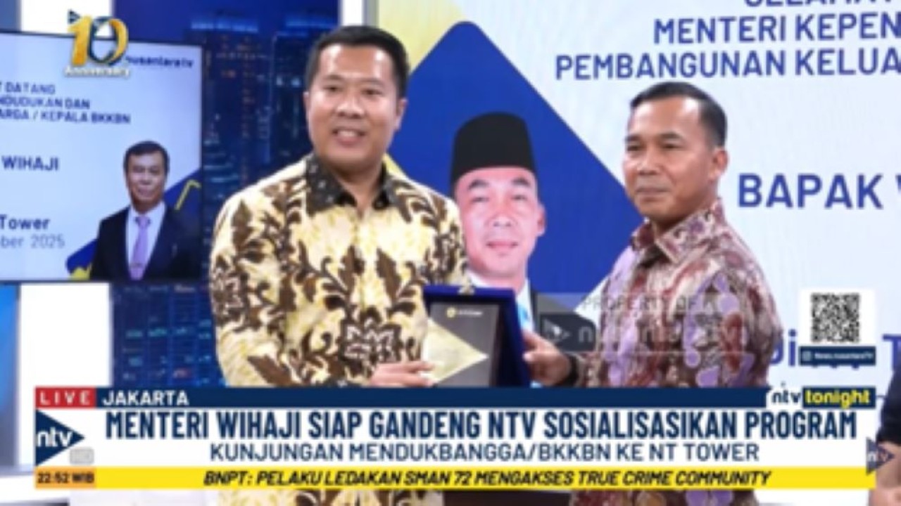Nusantaratv.com-Upaya memperkuat program kependudukan dan pembangunan keluarga terus didorong oleh Menteri Kependudukan dan Pembangunan Keluarga, Kepala BKKBN Wihaji. Dalam agenda kunjungannya ke NT Tower Nusantara TV, dirinya hadir sebagai narasumber dalam program Asta Cita sekaligus membuka ruang kolaborasi dalam sosialisasi program kependudukan dan keluarga.