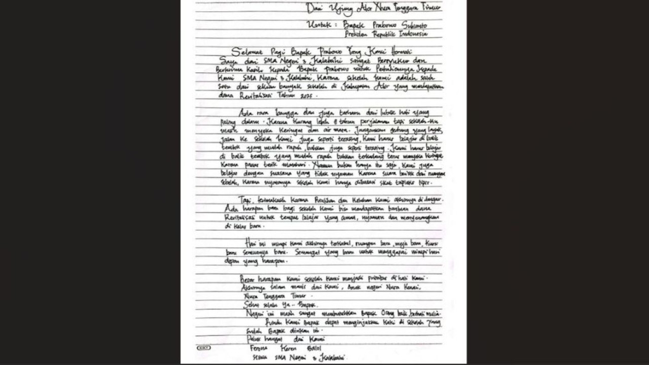 Di dalam suratnya, Ferona hanya ingin berterima kasih kepada Presiden Prabowo Subianto karena tempatnya menimba ilmu menjadi salah satu dari sekian banyak sekolah di Kabupaten Alor yang mendapatkan dana program Revitalisasi Sekolah.