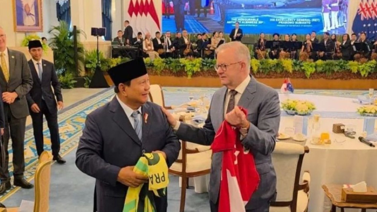 Presiden Prabowo Subianto dan PM Anthony Albanese saling tukar jersey Timnas Indonesia-Australia. (Foto: Antara)