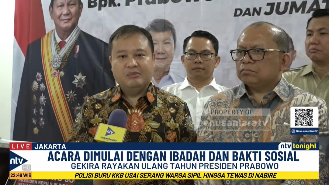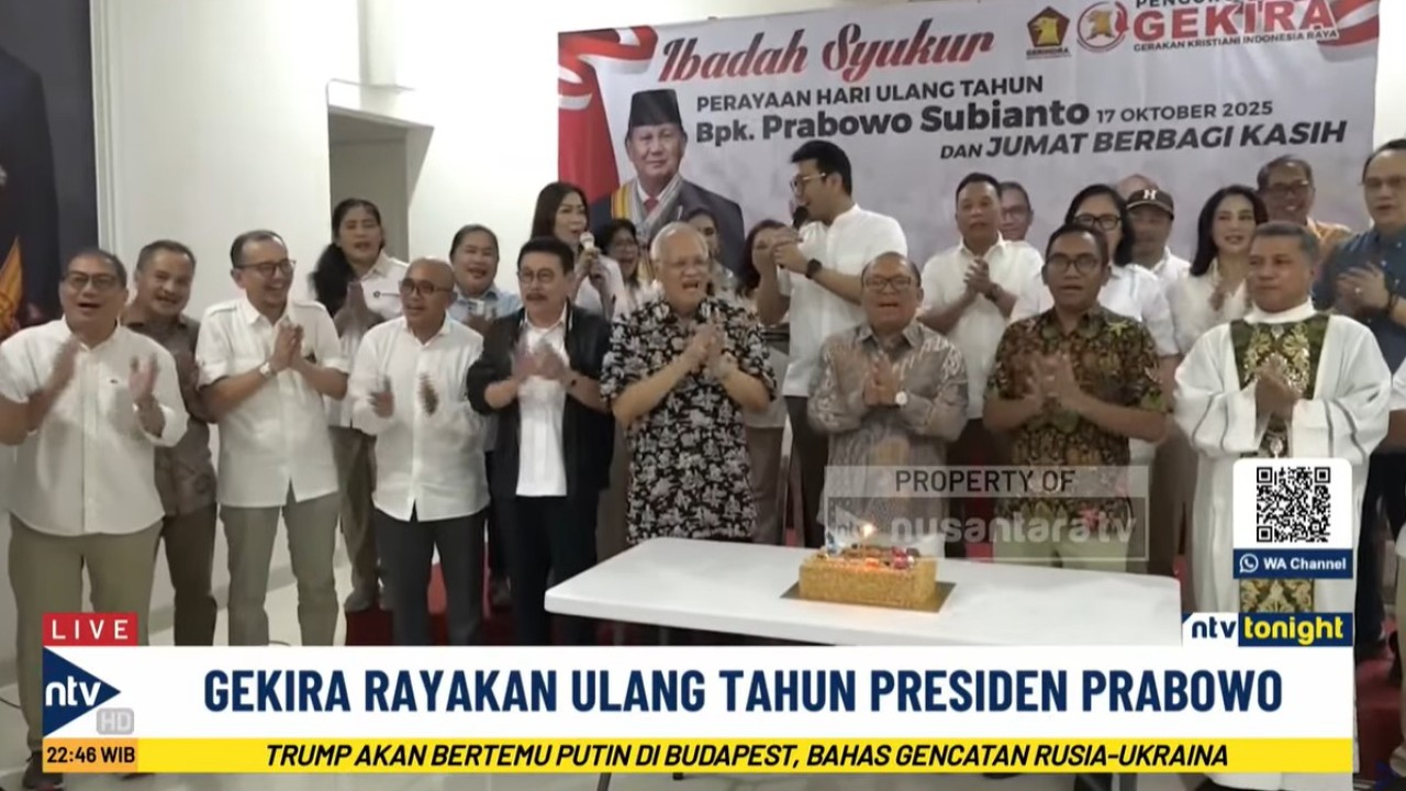 Nusantaratv.com - Gerakan Kristiani Indonesia Raya (GEKIRA) menggelar ibadah syukur dan kegiatan Jumat Berbagi Kasih untuk merayakan ulang tahun ke-74 Presiden Republik Indonesia, Prabowo Subianto, di kantor Sekretariat Pengurus Pusat Gekira, Cempaka Putih, Jakarta Pusat, Jumat (17/10/2025) siang.
