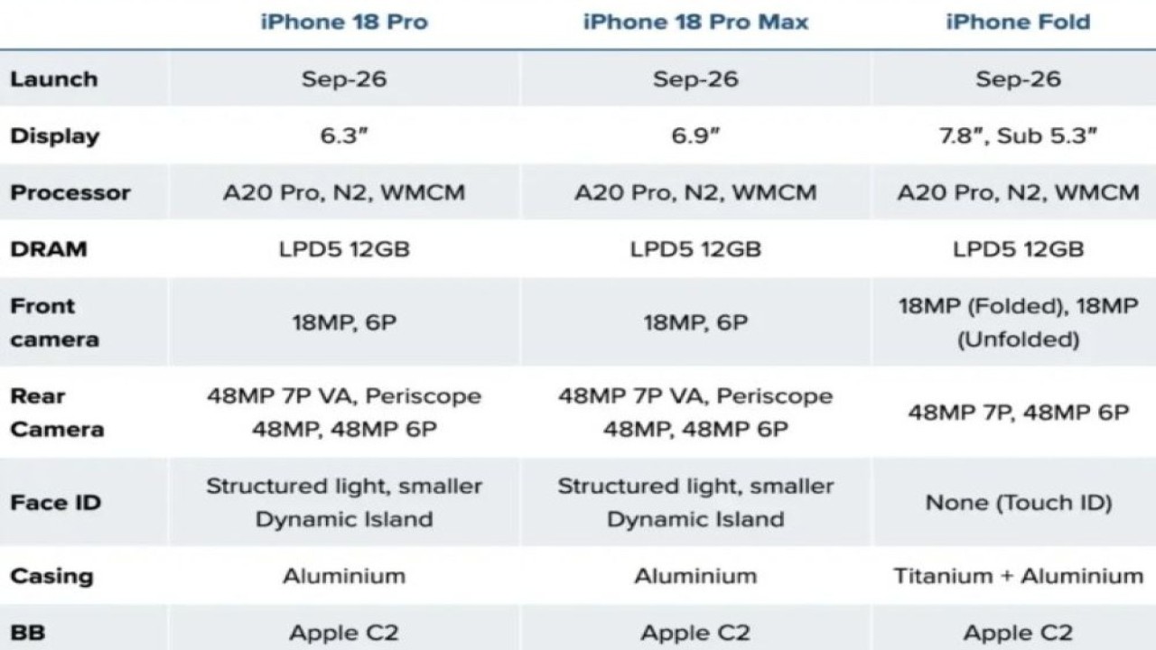Spesifikasi iPhone 18 Pro, Pro Max, dan iPhone Fold terungkap. (Foto: Istimewa via Gizmochina)